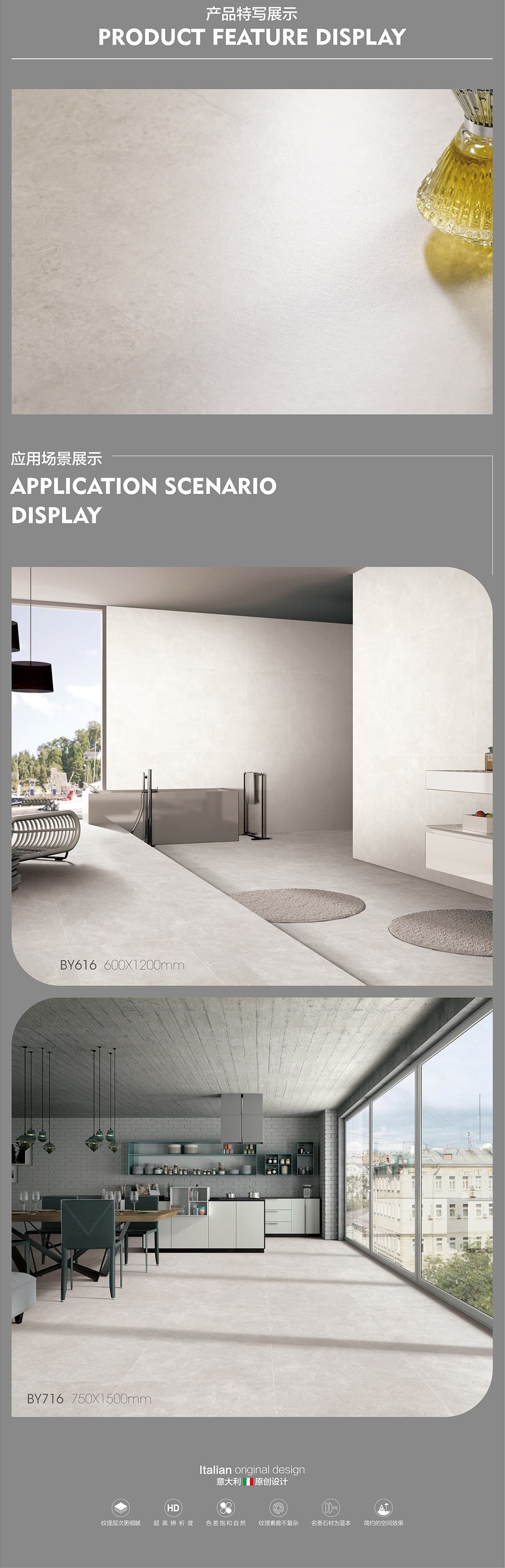 產品特性 表面柔和,防污效果強,防滑R10指標高,抗折強度好